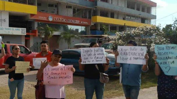 Tampico, Tam.- Padres de familia protestaron la mañana del jueves a las afueras de un colegio cristiano, toda vez que se quejan de un caso de transfobia hacia una de las alumnas, pues no le permitieron participar en el baile de graduación de la escuela en donde pretendía ir vestida de varón para bailar el vals con una compañera.