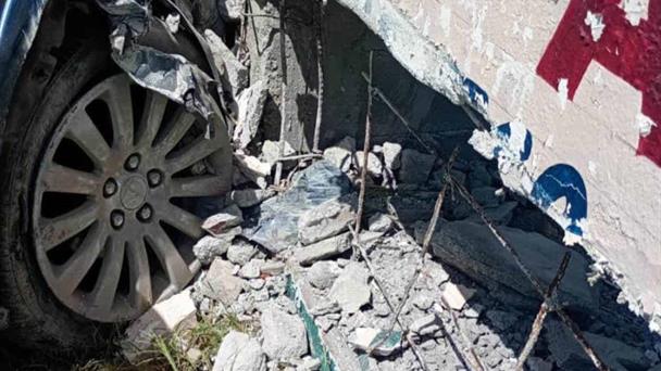 El percance ocurrió alrededor de las 12:15 horas, cuando el Buick chocó primero contra un automóvil de la marca Nissan, tipo Sentra, para posteriormente perder el control y proyectarse contra la barda de material.