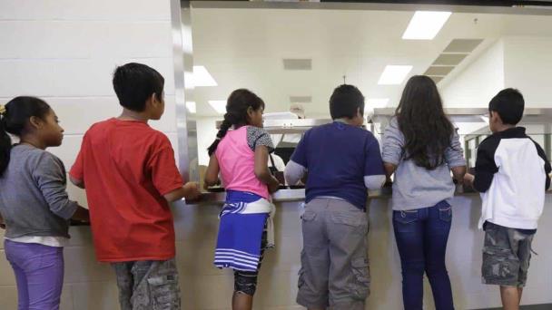 Menores inmigrantes detenidos forman una fila en la cafetería del Centro Residencial del condado de Karnes, un centro de detención para familias inmigrantes en la ciudad de Karnes, Texas.