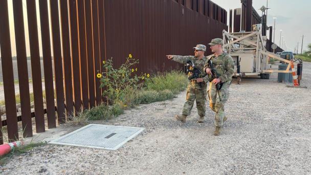 Soldados de la Guardia Nacional de Texas patrullan el muro fronterizo cerca de McAllen para detener la inmigración ilegal.