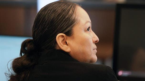 Adriana Alemán, de 44 años, mira hacia la sala durante un receso en su juicio por asesinato en el Tribunal del Distrito 92, en el Palacio de Justicia del Condado de Hidalgo, en Edinburg.