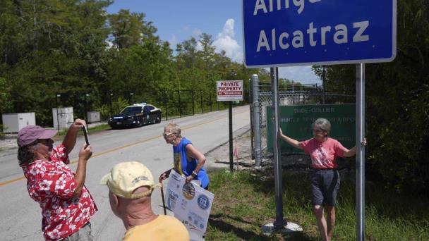 Personas se toman fotos delante de un cartel que dice "Alcatraz de los caimanes" en la entrada de una cárcel para inmigrantes en los Everglades de Florida.