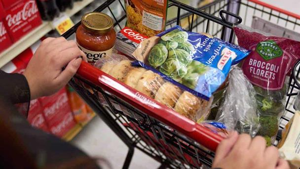 Una persona que recibe asistencia alimentaria compra alimentos en un supermercado en Bellflower, California.