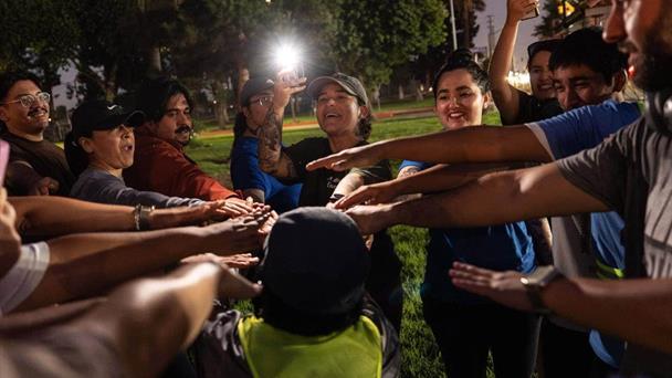 Iris Delgado, centro, fundadora del Huntington Park Run Club, encabeza un saludo colectivo tras su carrera en Huntington Park, California.