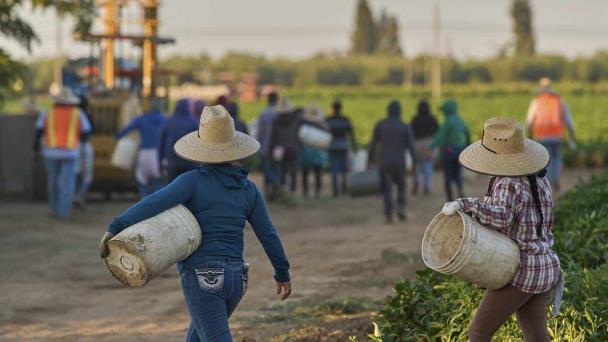 Jornaleros inmigrantes se dirigen a los cultivos, el 18 de julio de 2025, en Fresno, California.