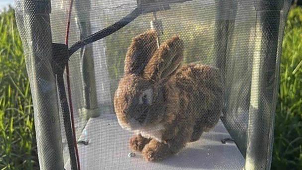 En esta imagen proporcionada por el Distrito de Manejo de Agua del Sur de Florida, un conejo robótico se ve en los Everglades de Florida.
