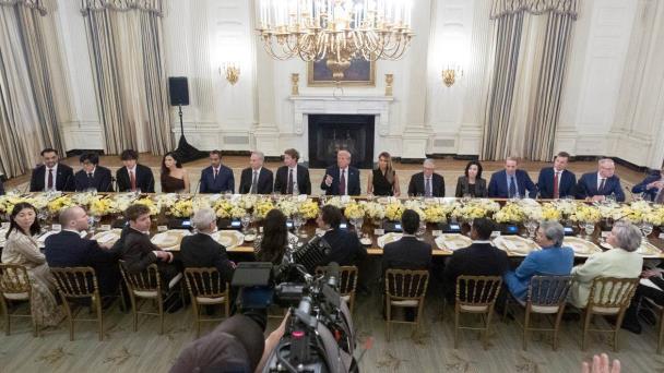 El presidente Donald Trump le indica a un periodista que le haga una pregunta durante una cena con directivos de empresas tecnológicas en el Comedor de Estado de la Casa Blanca, en Washington.