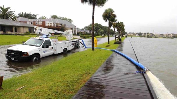 Un trabajador extrae agua de una calle inundada en el área de Houston después de que el huracán Harvey causara inundaciones masivas el 26 de agosto de 2017.
