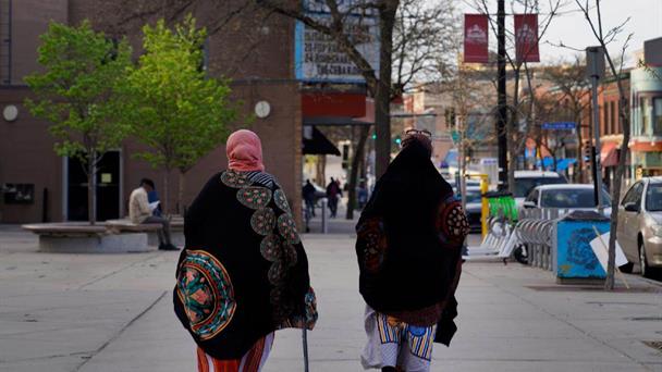 Mujeres caminan por una calle del barrio predominantemente somalí de Cedar-Riverside, en Minneapolis.