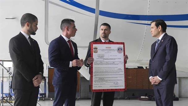 El secretario de Estado de Estados Unidos, Marco Rubio, a la derecha, escucha a Edwin F. Lopez, agregado del Departamento de Seguridad Nacional, segundo por la izquierda, junto al avión del gobierno venezolano que Rubio anunció estaba siento confiscado por Estados Unidos, durante una conferencia de prensa en el aeropuerto de La Isabela en Santo Domingo, República Dominicana.