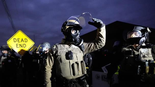 Policías se enfrentan a manifestantes en Broadview, Illinois.