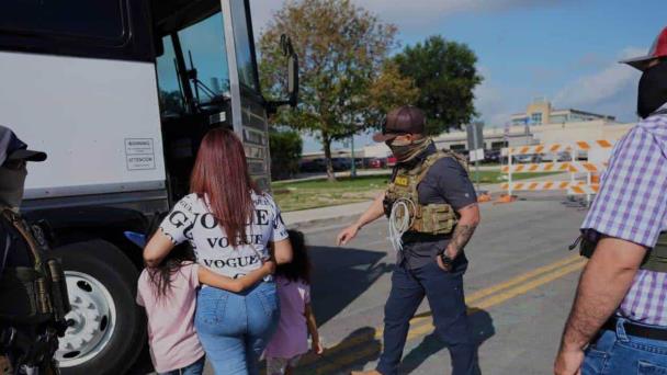 Una madre conduce a sus hijos hacia un autobús escoltados por agentes del ICE.