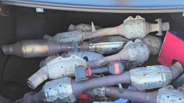 En la cajuela del vehículo fueron localizados 10 convertidores catalíticos ocultos. El conductor fue arrestado al confirmarse que contaba con una orden de aprehensión activa, mientras que tanto él como el pasajero fueron puestos a disposición de las autoridades por el delito de posesión no autorizada de estos dispositivos, considerado una felonía estatal.