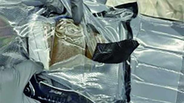 Dentro de su equipaje facturado había dos bolsas grandes selladas al vacío. En cada bolsa había objetos envueltos en camisetas blancas. Dentro de las camisetas había bolsas negras selladas al vacío.