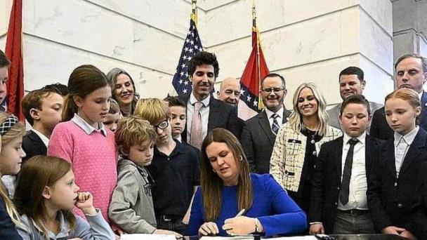 La gobernadora de Arkansas, Sarah Huckabee Sanders, firma una reforma de la ley educativa en el Capitolio estatal en Little Rock, Arkansas.