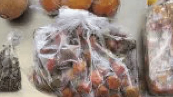 Sobre una mesa de inspección se encuentra una bolsa con más de 100 chinches vivas, ciruelas pasas, mangos y mameyes incautados.