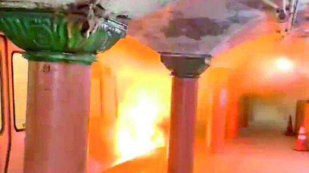 El video luego muestra llamas de color naranja brillante que se elevan casi hasta la parte superior del vagón del tren desde los rieles.