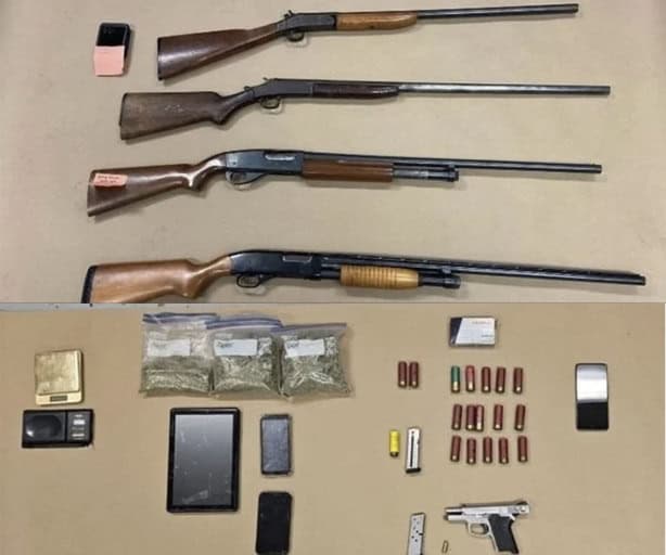 En el primero, junto a la banqueta, detuvieron a Leticia Amanda Talamantes, de 41 años y a Ismael Ledesma, de 52, por posesión de marihuana y 4 carabinas.