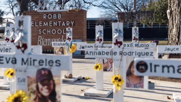 Cruces conmemorativas afuera de la Escuela Primaria Robb, de Uvalde, donde 19 estudiantes y dos maestros fueron asesinados dos años antes.