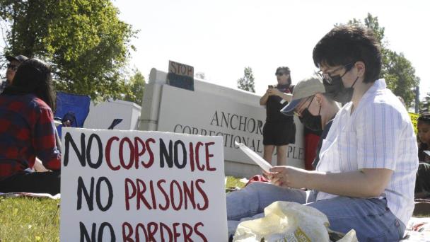 Manifestantes se sientan en el jardín del Complejo Penitenciario de Anchorage, Alaska.