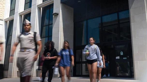 Estudiantes abandonan la Facultad de Artes Liberales y Ciencias Sociales de la Universidad Texas A&M el 18 de septiembre de 2025 en College Station.