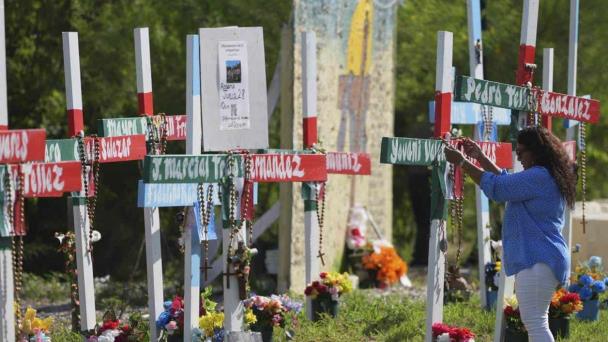 Angelita Olvera visita un sitio de homenaje en San Antonio, Texas, el viernes 27 de junio de 2025, en honor a las víctimas y sobrevivientes de una trágica operación de tráfico de personas en la que decenas de migrantes fueron encontrados sin vida en un camión sin aire acondicionado en 2022.