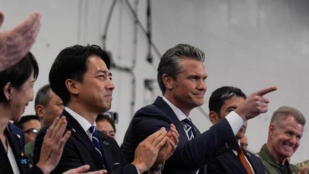 El secretario de Defensa de EEUU, Pete Hegseth, en el centro a la derecha, con la primera ministra japonesa, Sanae Takaichi, a la izquierda, y el ministro de Defensa, Shinjiro Koizumi, mientras escuchan al presidente Donald Trump hablar con miembros del Ejército a bordo del USS George Washington, un portaaviones atracado en una base naval estadounidense, en Yokosuka, al sur de Tokio, el martes 28 de octubre de 2025.