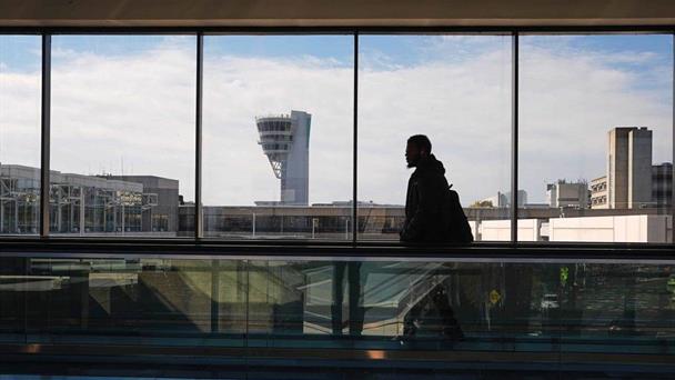 Un viajero camina frente a una torre de control el 5 de noviembre de 2025, en el Aeropuerto Internacional de Filadelfia.