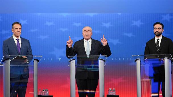 El debate entre los candidatos a alcalde de Nueva York, en Nueva York el 16 de octubre del 2025. De izquierda a derecha: el independiente Andrew Cuomo, el republicano Curtis Sliwa y el demócrata Zohran Mamdani.