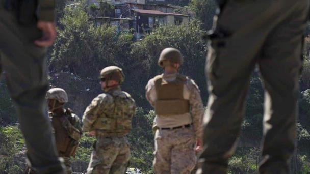Agentes de la Patrulla Fronteriza y miembros del ejército miran hacia Tijuana, México, mientras se encuentran entre dos muros fronterizos, el 21 de marzo de 2025, en San Diego.