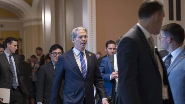 El secretario del Tesoro, Scott Bessent, centro, sale de una reunión a puerta cerrada con republicanos que trabajan para impulsar el ambicioso proyecto de ley de política interna del presidente Donald Trump, en el Capitolio de Washington.