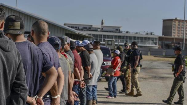 Trabajadores esposados tras ser arrestados por el Servicio de Inmigración y Control de Aduanas (ICE) en el hipódromo, hotel y casino Delta Downs, en la parroquia de Calcasieu, cerca de Vinton, Luisiana.