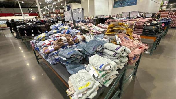 Ropa de niños apilada sobre una mesa en un Costco, el jueves 23 de enero de 2025.