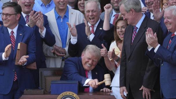 El presidente Donald Trump golpea un mazo que le entregó el presidente de la Cámara de Representantes, Mike Johnson (aplaudiendo en primer plano, a la izquierda), después de que promulgó su ley de recortes fiscales y al gasto público en la Casa Blanca.