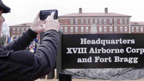 Una persona toma una fotografía del letrero develado cuando a Fort Liberty se le cambió el nombre a Fort Bragg, durante una ceremonia en esa base el 7 de marzo de 2025, en Carolina del Norte.
