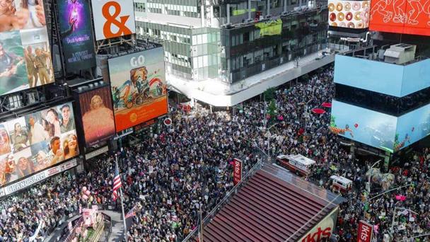 Antes del mediodía, varios miles de personas se habían reunido en Times Square, coreando “Trump debe irse ahora”, y ondeando carteles, algunos de ellos con palabrotas, con eslóganes insultantes para el presidente y condenando su imposición de medidas contra la inmigración. Algunas personas llevaban banderas estadounidenses.