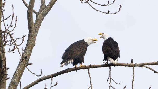Un par de águilas calvas descansan en un árbol junto a Union Bay, en Seattle.