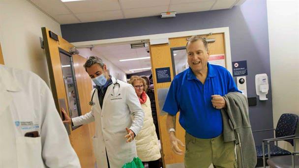 Esta imagen difundida por el Hospital General de Massachusetts muestra a Tim Andrews saliendo del hospital, el 1 de febrero de 2025, en Boston.