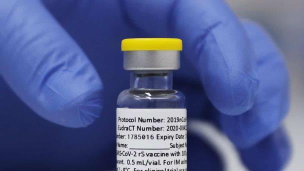 Un frasco de la fase 3 de la vacuna de Novavax contra el coronavirus preparada para su uso en un ensayo en el hospital de la Universidad St. George en Londres.
