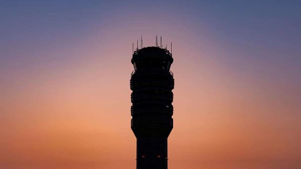 La torre de control del Aeropuerto Nacional Ronald Reagan de Washington se ve al amanecer en Arlington, Virginia.