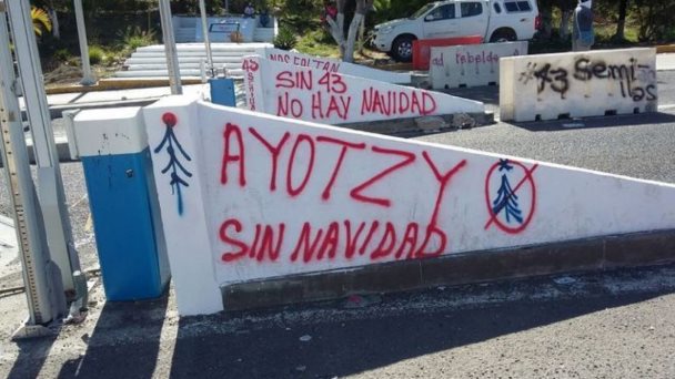 Exhibieron mantas con la leyenda "coopera con los padres de familia", así como "Ayotzi sin Navidad", "sin 43 no hay Navidad". Los padres de familia y normalistas piden a los automovilistas una cooperación voluntaria.