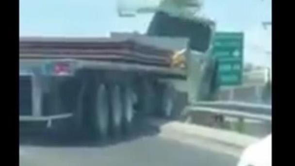 El incidente fue captado por un automovilista y ocurrió cuando el chofer del vehículo que transportaba placas de acero, con razón social Autolíneas Express González, presuntamente intentó rebasar a otro tráiler, lo que provocó que perdiera el control, se estrellara contra el muro de contención y cayera.