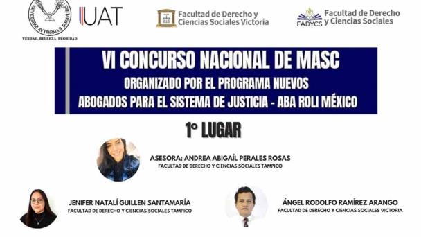Cd. Victoria, Tam.- Alumnos de la Universidad Autónoma de Tamaulipas (UAT) pertenecientes a los distintos equipos de litigación de las licenciaturas en Derecho obtuvieron el primer lugar del Sexto Concurso Nacional de Mecanismos Alternos de Solución de Controversias (MASC) organizado por el Programa de Nuevos Abogados para el Sistema de Justicia - ABA ROLI México.