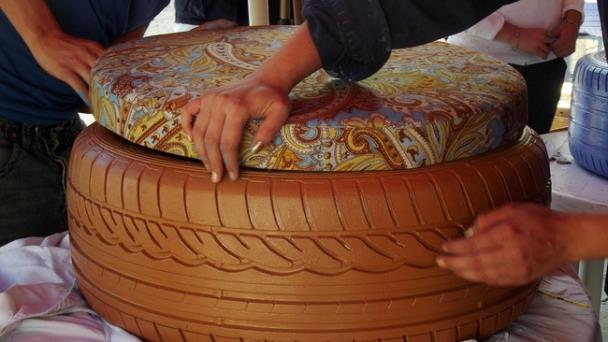 El equipo de Enactus de la UVM, encabezado por Angélica Cifuentes, transforma llantas de automóviles en taburetes, sillas y mesas, con el empleo no sólo de neumáticos sino también de retazos de tela y madera que fueron donados por empresas.