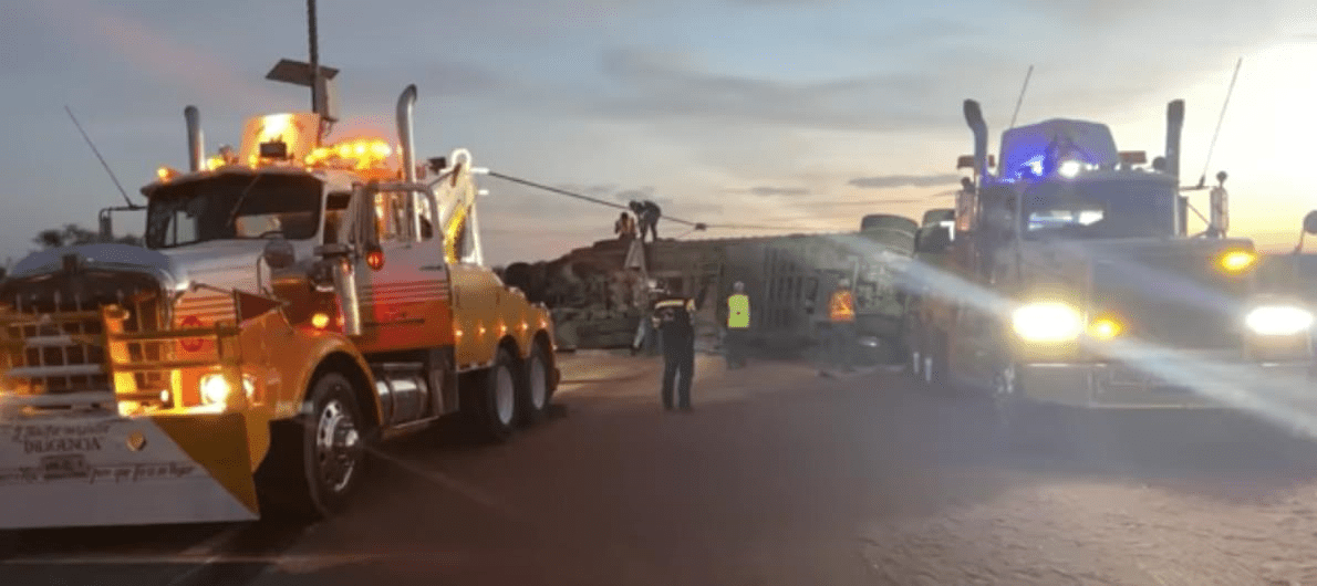 Un chofer perdió el control y volcó un tracto camión cargado con 36 toneladas de sorgo en el libramiento Sur ll en #Reynosa.