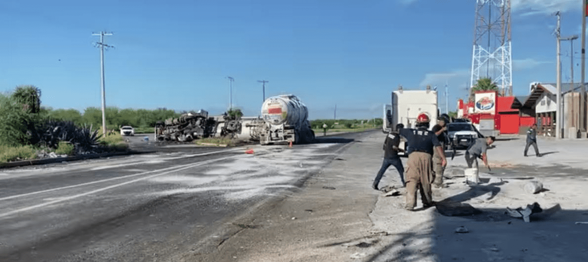 Volcadura de pipa cargada con más de 32 mil litros de combustible en la carretera a Monterrey en #Reynosa.