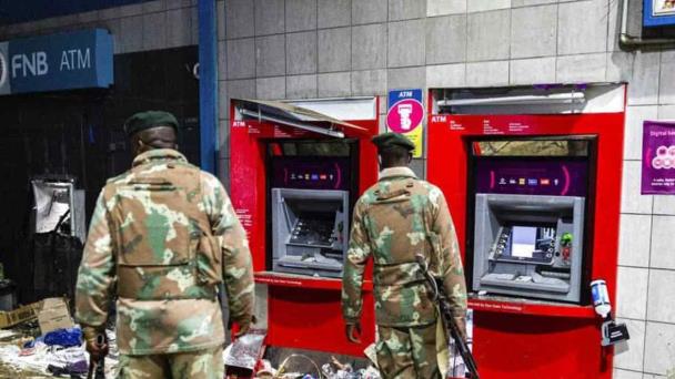 Soldados vigilando un cajero automático en una zona comercial de Soweto, Johannesburgo.